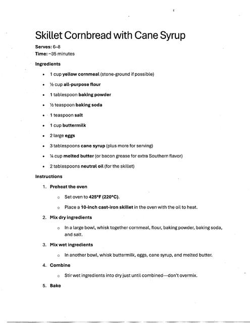 Skillet Cornbread with Cane Syrup: Crispy-edged cornbread baked in cast iron, served with the deep, smoky sweetness of Florida cane syrup.