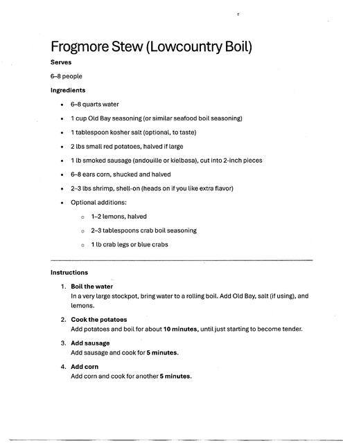 Frogmore Stew (Low Country Boil): The social centerpiece. Shrimp, sausage, corn, and potatoes boiled in Old Bay and lemons.
