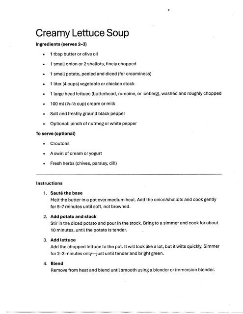 Creamy Lettuce Soup: A light, vibrant starter to open the palate. Finished with a swirl of cream and fresh chives.